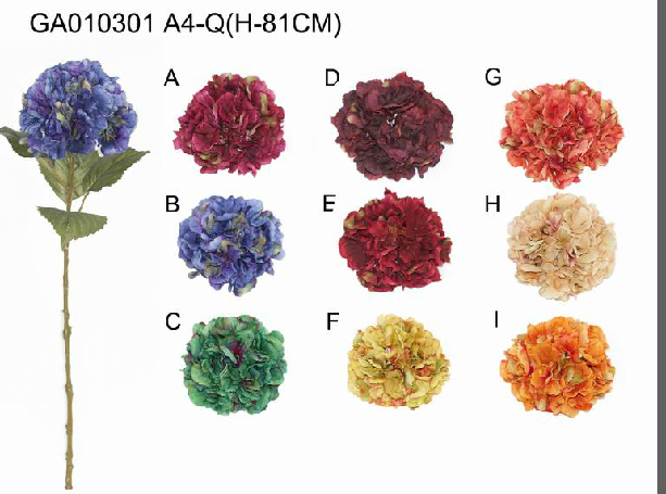 ITEM NO.: GA010301 A4-Q DESC.: Single hydrangea(autumn)(H-81CM) PACKING: 12PC/INNER BOX, 72PC/MASTER CARTON, 0.28CBM/MASTER CARTON