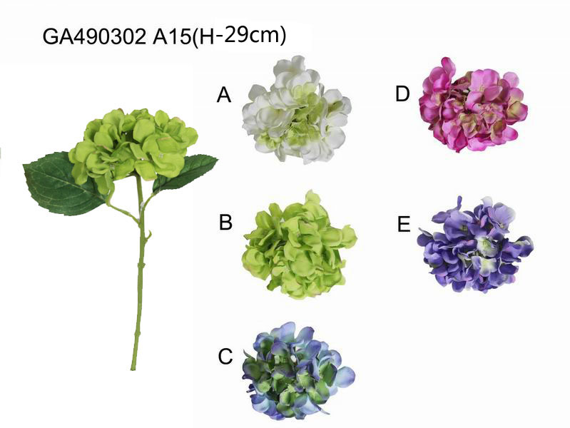 ITEM NO.: GA490302 A15 DESC.: Single hydrangea(H-29CM) PACKING: 24PC/INNER BOX, 288PC/MASTER CARTON, 0.14CBM/MASTER CARTON